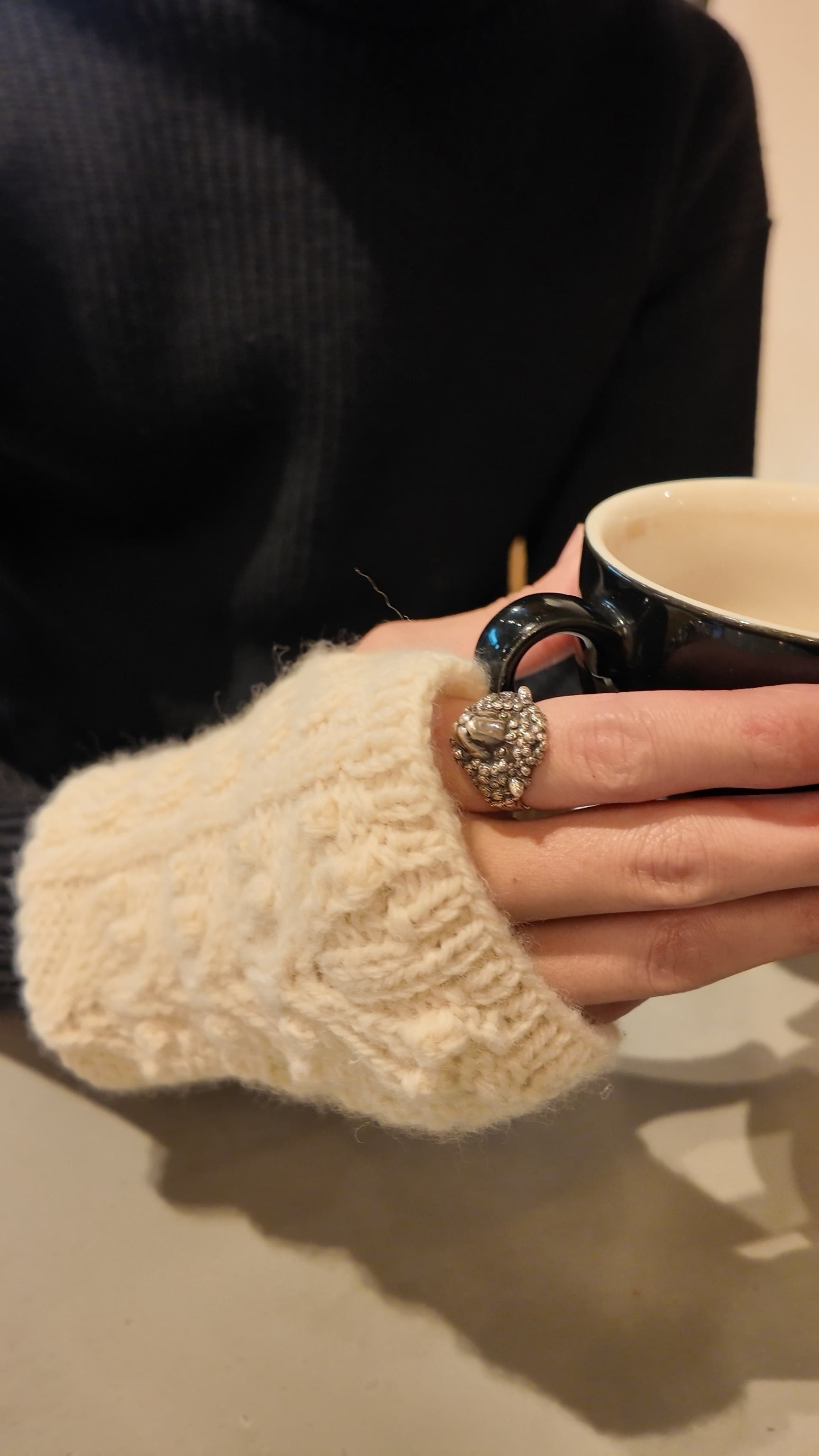 This Hand Warmer pattern is inspired by the traditional Aran knitting patterns of the Magee clan. It features a combination of classic Aran stitches, including simple cables, honeycomb, and the Tree of Life.